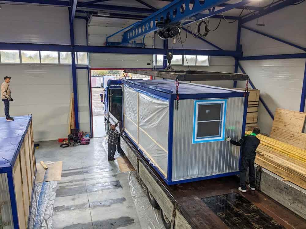 У нас большой крытый производственный цех, площадь которого позволяет собирать несколько конструкций одновременно и независимо от погодных условий, работа не останавливается не на минуту. В штате компании всегда работают высококвалифицированные специалисты, разделенные на бригады, благодаря этому нам удалось наладить процесс сборки так что простоев в работе нет и процесс изготовления большого блок-контейнера занимает всего пару дней.